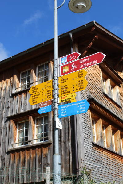Diverse Wegweiser im Dorf Krinau zeigen die Vielfalt an Wander-, Bike- und Erlebnisrouten